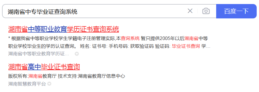 第一步、百度搜索“湖南省中專畢業證查詢系統入口”或者“湖南省中專學歷查詢”,搜索結果下圖: